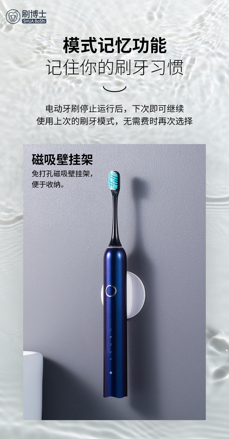 刷博士【S300智能聲波電動牙刷】是一款集潔齒、護理及體驗煥然一新于一身的多功能聲波電動牙刷,采用一鍵式的簡約設(shè)計,5檔清潔模式,隨心掌控;此外,植入了模式記憶功能,牢牢記住你的刷牙習(xí)慣,下次刷牙,無需費時再次選擇;強勁的續(xù)航功能,一年僅充1次電;高顏值的顏色設(shè)計,皓月白、睿智黑、深邃藍等多種顏色選擇,遇上不同風(fēng)格的你。